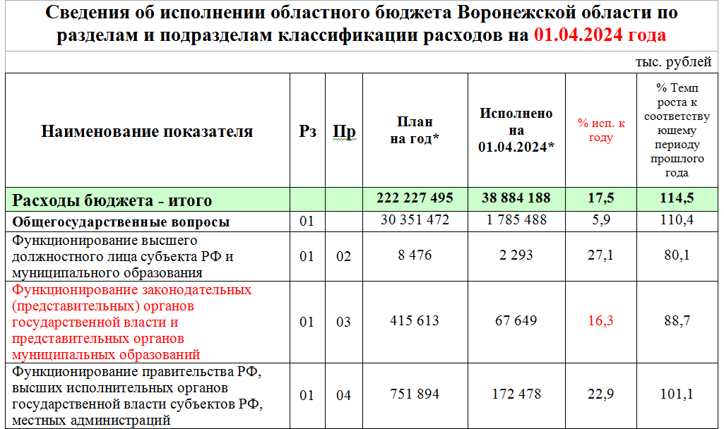 На крайне низком уровне от годового объема расходования средств оказались бюджетные статьи «Дорожное хозяйство», «Жилищное хозяйство», «Благоустройство». При том, что только на содержание и ремонт автомобильных дорог по 2024 году выделяется свыше 28 млрд рублей (за квартал было израсходовано 7,8% от годового объема), но качество их уборки от снегопадов многократно вызывало недовольство воронежских автомобилистов и пешеходов.