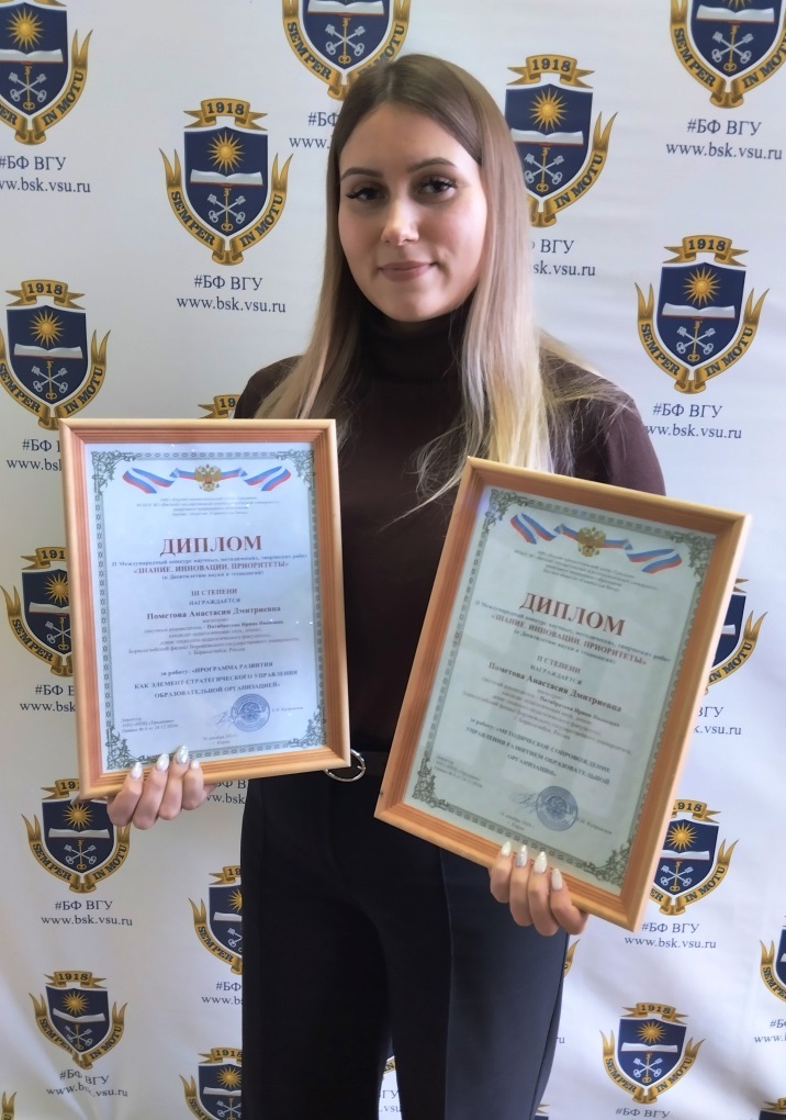 Анастасия Пометова, магистрант второго курса направления 44.04.01 Педагогическое образование, стала призёром II Международного конкурса научных, методических, творческих работ «Знание. Инновации. Приоритеты», посвящённого Десятилетию науки и технологий в Российской федерации.
