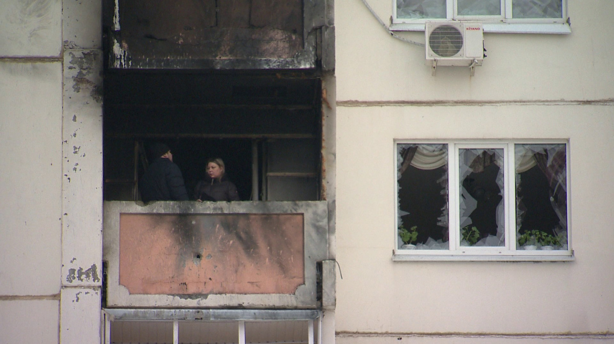 Сильнее всего пострадала квартира на восьмом этаже. Там на балконе произошел пожар – из-за попадания обломков беспилотника. Поэтому ночью жильцов эвакуировали. Жительница дома Елена Федяинова рассказывает, её шестилетний сын просто по счастливой случайности ночью до взрыва перебрался на кровать с дивана, который стоял прямо под окном.