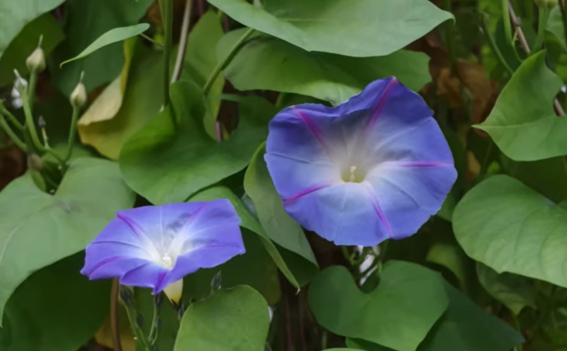 Ипомея же трехцветная (наркосодержащая) не самый распространенный на наших дачных участках сорт. Ее можно отличить по крупным цветкам, которые напоминают граммофон, в соцветиях по 2-3 штуки в пучке. Они могут быть бледно-голубыми или голубыми со светлым центром, а когда закрываются, то приобретают пурпурный оттенок.