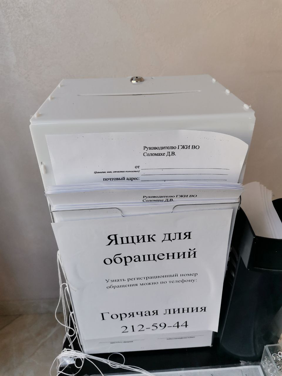 В неприемные часы (дни) предусмотрен альтернативный способ подачи обращений в ГЖИ: на 1 этаже в БЦ «Романовский» (г. Воронеж, ул. Кирова, д. 6а) размещен ящик для обращений.