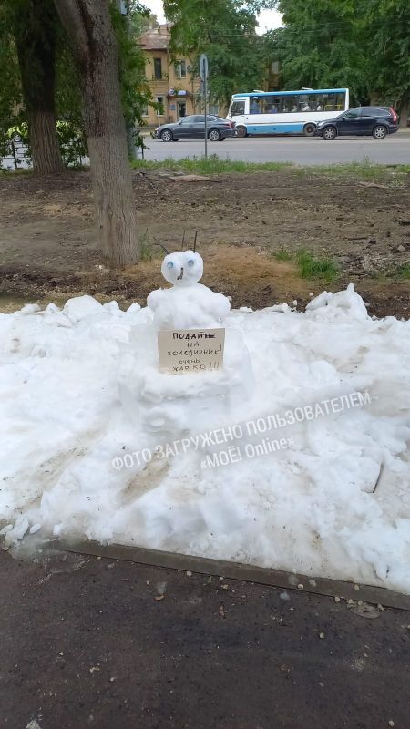 «Подайте на холодильник! Очень жарко!» — написано на картонной табличке, которую держит снеговик.