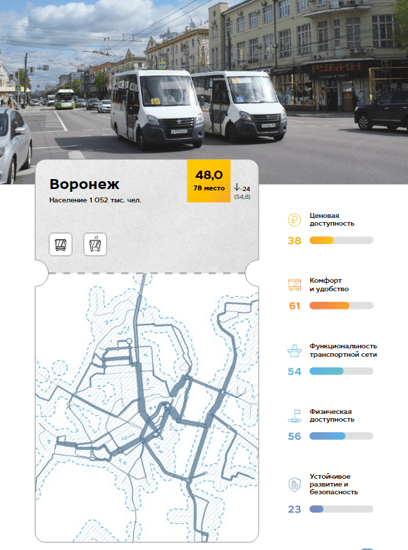 Фото: рейтинг городов России по качеству общественного транспорта от SIMETRAГород опустился на 24 строчки, Воронеж набрал 48 баллов из 100 возможных. Рейтинг рассчитывался из пяти показателей: ценовой доступности — 38 баллов; комфорта и удобства — 61 балл; функциональности транспортной сети — 54 балла; физической доступности — 56 баллов; устойчивого развития и безопасности — 23 балла.