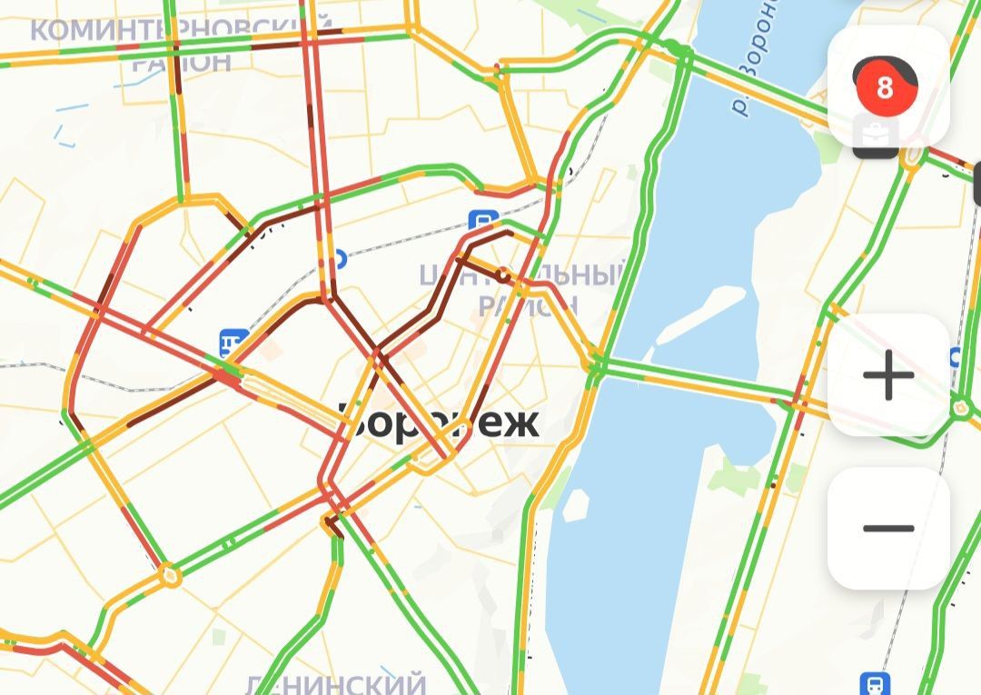Восьмибалльные пробки днём сковали движение в ВоронежеВосьмибалльные пробки сковали движение в Воронеже сегодня днём, 22 февраля, если верить данным сервиса «Яндекс. Карты».