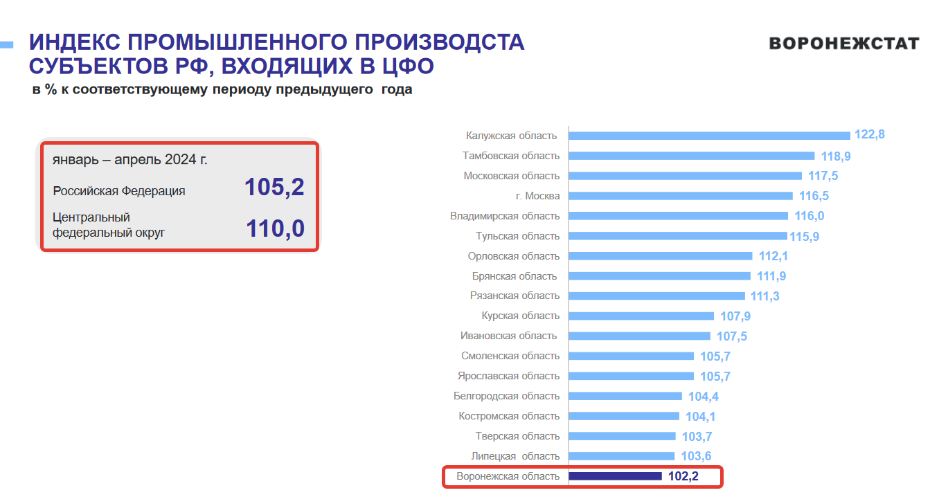 Индекс промышленного производства в Воронежской области за январь – апрель показал (по срав нению с аналогичным пер иодом 2023 г.) небольшой рост и со ставил 102,2 процента. Однако э то самый низкий показатель среди субъектов России, входящих в Центральный федеральный округ.